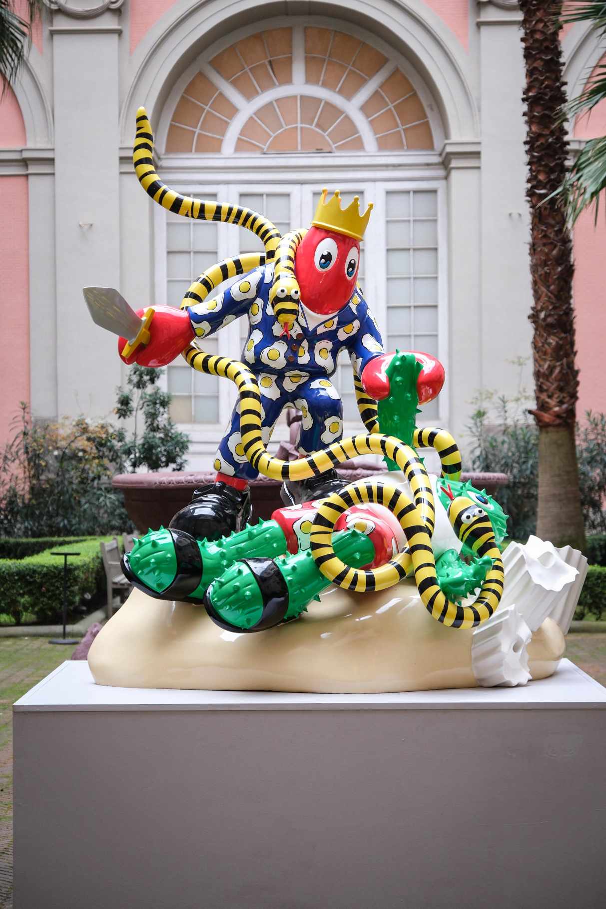 Ad ingresso del Museo, dunque, è possibile trovare diverse opere che, pur riecheggiando il mondo dei cartoon, non rinunciano a svelare i propri riferimenti dotti: ecco, dunque, le grandi tele in cui la lotta tra le aragoste sembra una rielaborazione postmoderna della battaglia di Isso, i quadri che riprendono i mosaici pompeiani con polpo e aragosta, le sculture marmoree con riferimenti al mito di Perseo testimoniato in vari affreschi vesuviani. Non mancano anche resine che, in forme e colori, ricordano le ceramiche greche e magnogreche.