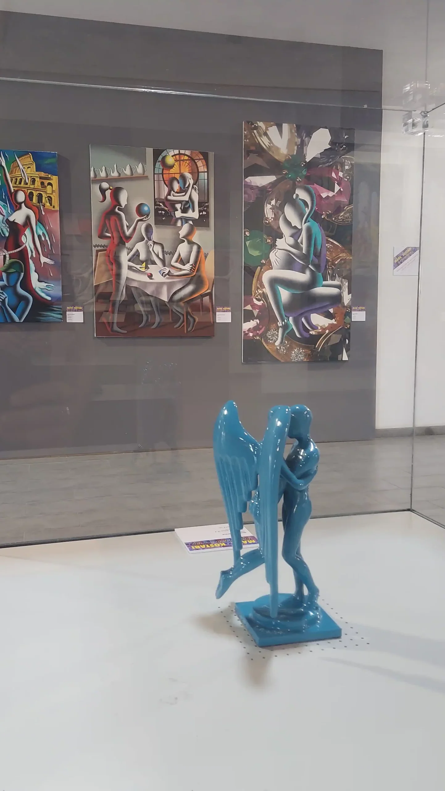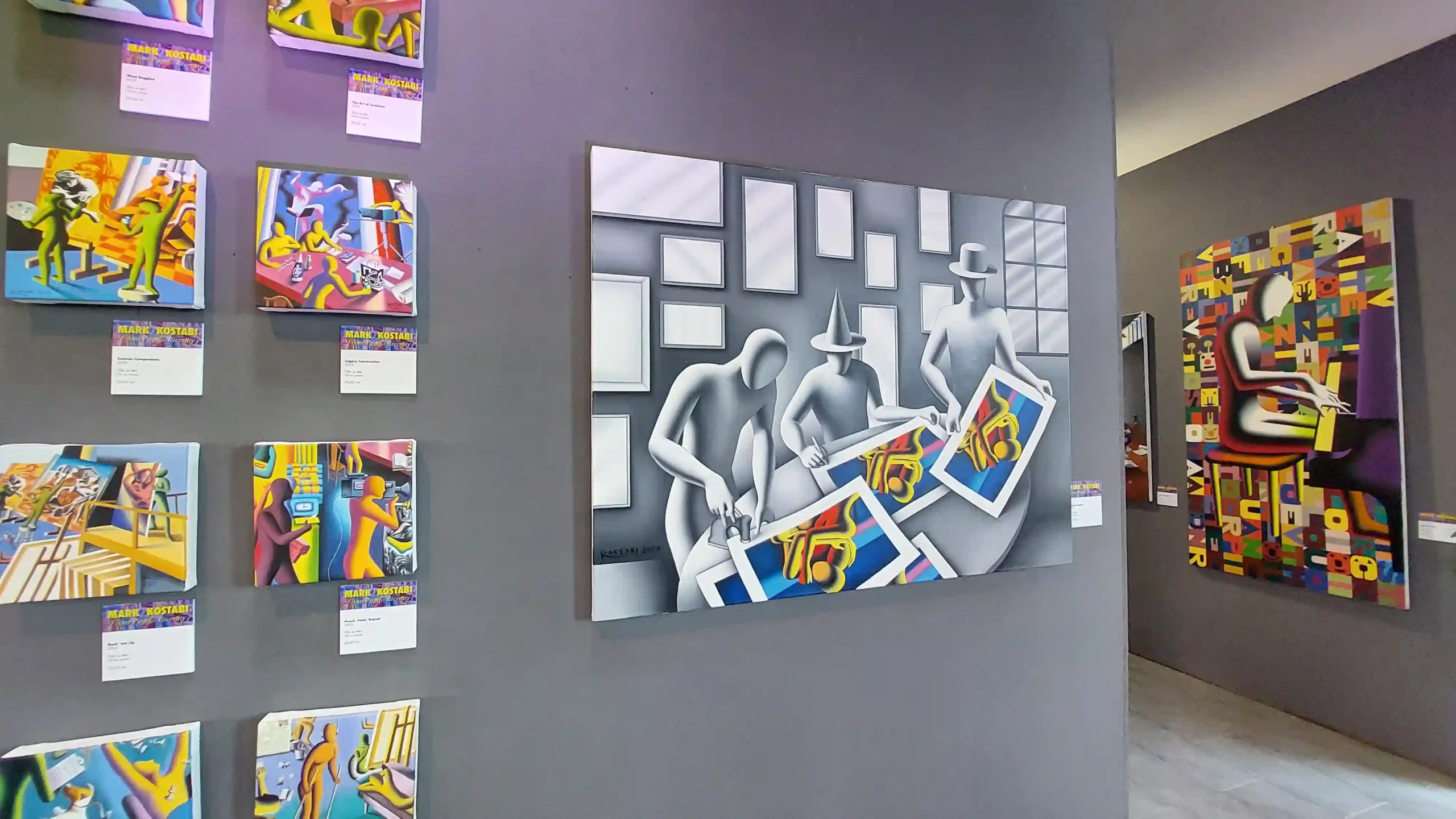 In mezzo i capolavori degli anni ’90 come The Studio System o la rappresentativa tela The Rhythm of Inspiration, esposta nella parte centrale della mostra e alla cui importanza Giuliano Gasparotti e Francesco Mazzei hanno dedicato un’installazione e un video omaggio (visibile nella Mirror Room), con cui i visitatori potranno immergersi nell’atmosfera del Kostabi World, lo studio/galleria fondato da Mark a New York nel 1988. Oltre ai disegni e ai grandi capolavori su tela, sarà inoltre possibile ammirare anche alcune sculture e grafiche realizzate dall’artista, alle quali si aggiungeranno, a completamento del viaggio nella Pop Art, i tanti memorabilia presenti per la felicità dei collezionisti e degli appassionati del movimento artistico.