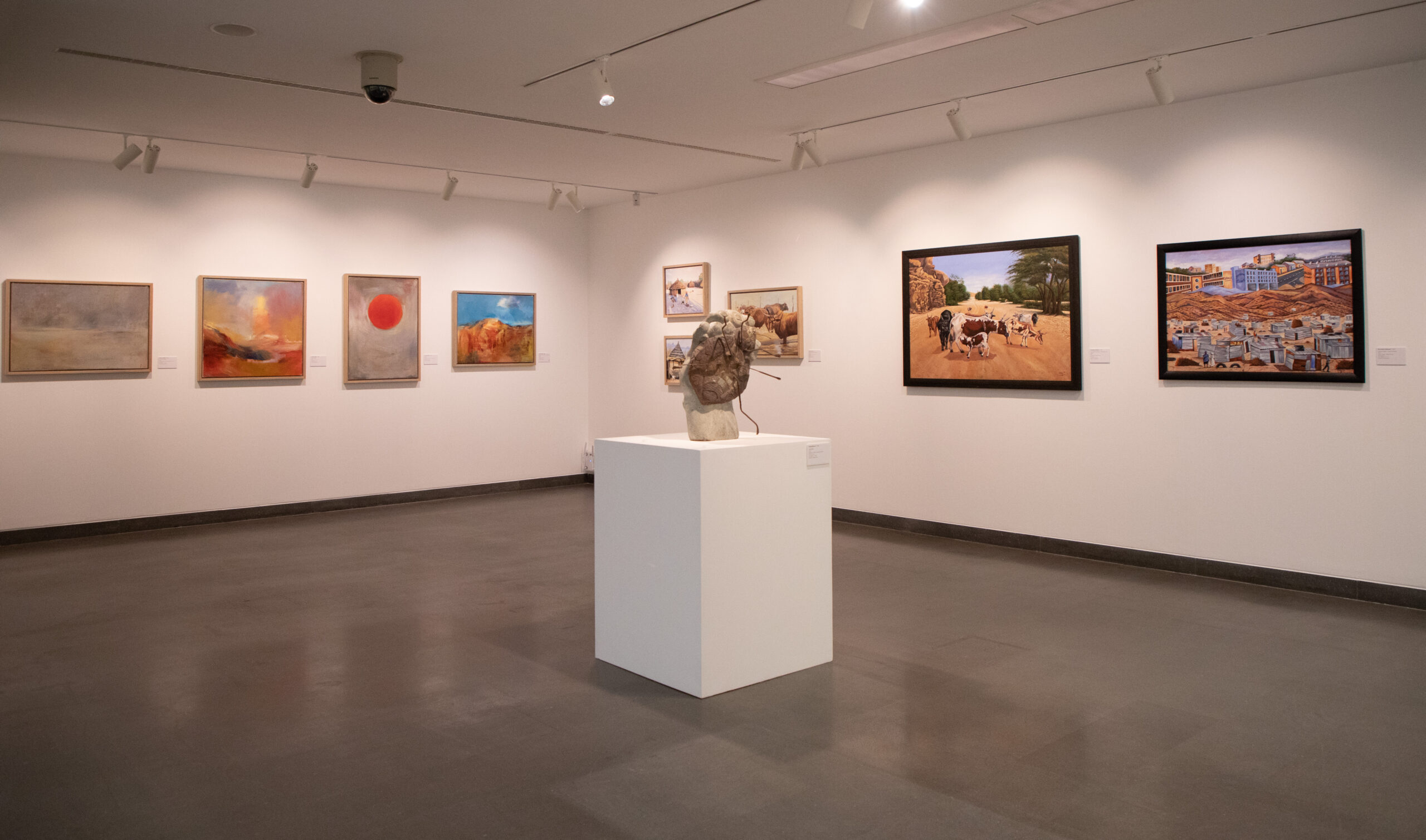 A metà strada tra la tradizione e l’esplorazione contemporanea, in mostra dialogano modalità espressive di artisti di età diverse che si confrontano su grandi temi come il paesaggio namibiano (Barbara Böhlke, Paul Kiddo, Nicky Marais), la spiritualità (Lukas Amakali, Papa Ndasuunje Shikongeni), la vita rurale (Salinde Willem, Frans Nambinga) e le questioni di attualità politica e sociale (Fillipus Sheehama, Alpheus Mvula).