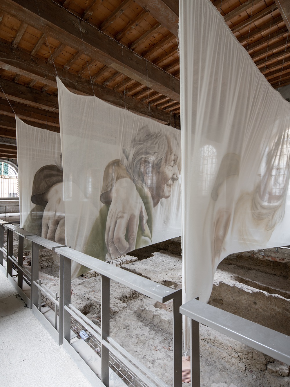 Alberto Ruce, classe 1988, è un artista urbano, siciliano di nascita e residente a Marsiglia. La sua pratica artistica è cominciata dal graffitismo e si inserisce nel tessuto della città. Le opere da lui realizzate per il Museo Sant’Orsola sono ‘effimere’ in quanto potrebbero essere trasformate durante l’ultima fase di lavori di ripristino dei locali dell’ex monastero. Il suo progetto creativo, intitolato Al di là di tutto, si articola in due ambienti: l’antica chiesa conventuale e l’ex spezieria. Ricollegandosi alla diversa funzionalità di questi spazi, ha scelto l’antica chiesa per la realizzazione di un’installazione che si ispira alla storia di di Lisa Gherardini, la presunta modella della Gioconda di Leonardo da Vinci, che trascorse i sui ultimi anni di vita nel convento di Sant’Orsola, assieme a sua figlia che vi era monaca. Nell’antica spezieria, invece, ha realizzato dei murales che evocano l’attività farmaceutica praticata dalle suore proprio in quel luogo. L’essenza effimera del progetto, inoltre, ha portato l’artista a sperimentare la lavorazione della cera, materiale mutevole e metamorfico, così come gli spazi di Sant’Orsola in corso di restauro. Per concepire le sue opere Alberto Ruce si è rivolto ad alcune donne del quartiere affinché posassero per lui come modelle, ribadendo l’urgenza di andare “oltre le mura” di Sant’Orsola e far sì che la comunità possa tornare a vivere i suoi spazi.