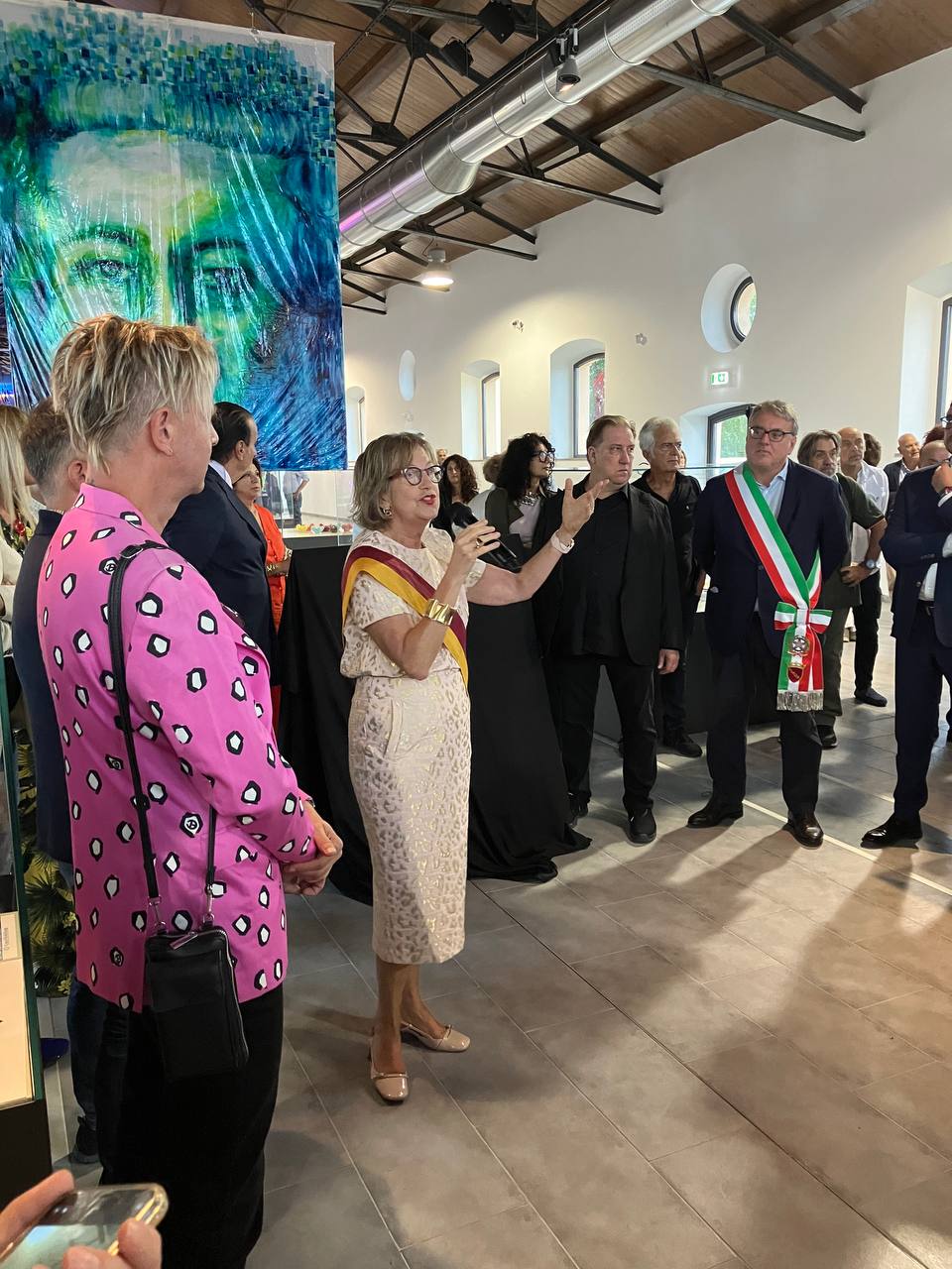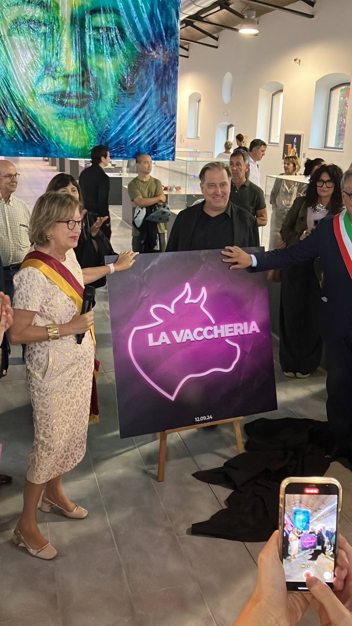 Dopo aver introdotto artisti e opere, l’inaugurazione ha visto come momento culminante la presentazione del nuovo logo della Vaccheria, la silhouette di una testa di toro viola fluo che è stata mostrata al pubblico grazie al gesto disvelatorio di Mark Kostabi.