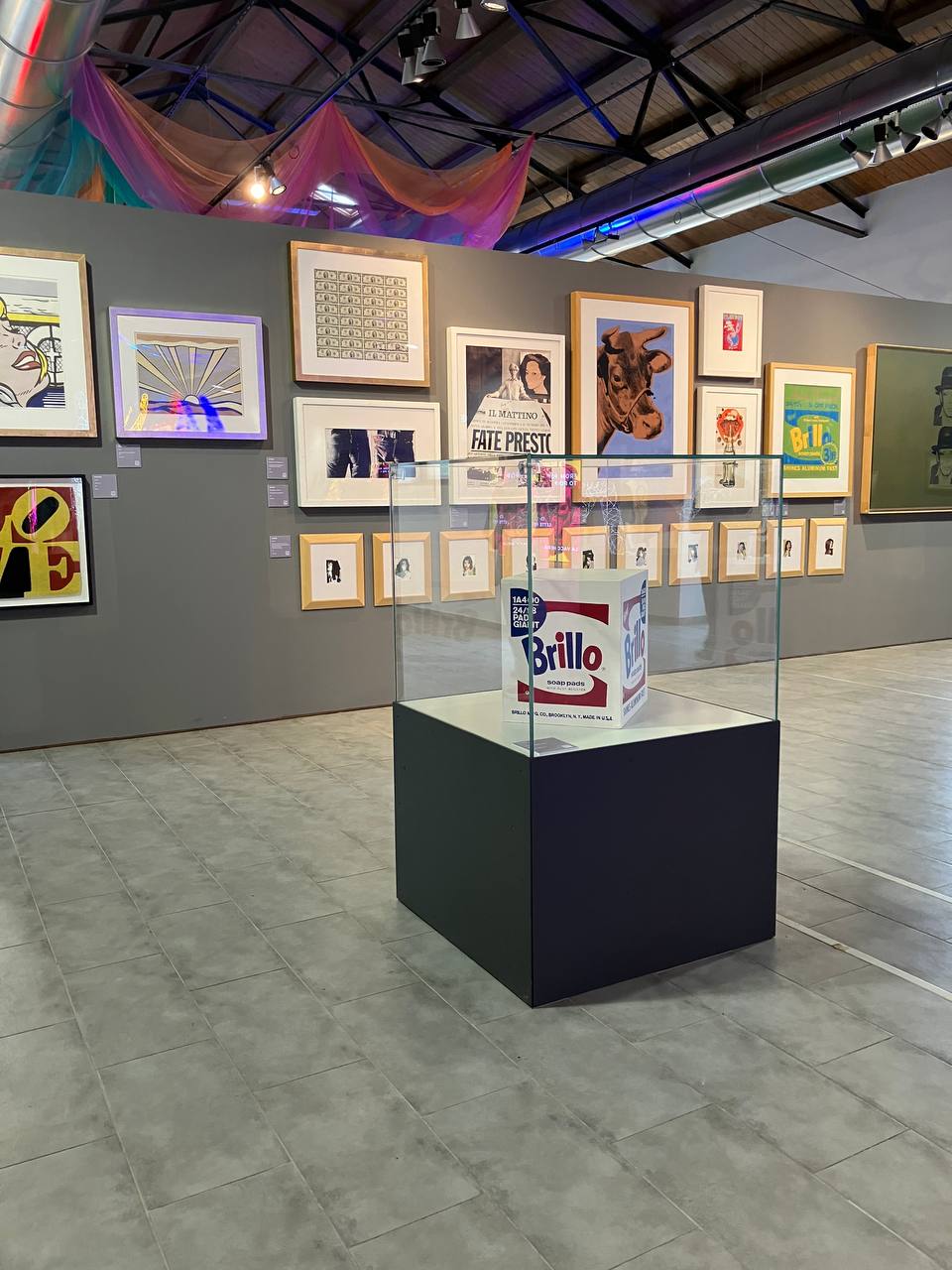 Nato intorno agli anni ’60, questo movimento artistico è ormai storia dell’arte contemporanea e si mostra al grande pubblico sia nei suoi tratti confidenziali che in quelli più sfuggenti. La sua prossimità alla nostra vita la vorrebbe in un continuo presente col nostro quotidiano, così da diventare quasi invisibile ai nostri occhi, velando così i suggerimenti che potrebbe proporci. Quale sia il confine tra espressione dell’esistenza e società del commercio è una delle domande che questo tipo d’arte continua a porre anche oggi e che lascia aperte agli spettatori le risposte che vorranno dare. La mostra offre la possibilità di attraversare le storie della Pop Art per mostrane i cambiamenti e le trasformazioni della società occidentale. La consapevolezza dell’esperienza passa sempre dalla conoscenza della storia che ci precede e così per chi vorrà un percorso più cronologico suggerirei di farsi richiamare dalla parte centrale della sala d’ingresso e dalle sculture poste di fronte ad essa. Con un pizzico di immaginazione saremo catapultati nella New York di Warhol, tra gli anni ’60 e ’70, in presenza di lavori più conosciuti, come una “Brillo box” precauzionalmente messa sotto vetro, al bel lavoro di serigrafie su Mick Jagger che dialoga idealmente con la grande sagoma di Jim Morrison di Lodola alla sua destra, che noi come spettatori vediamo invece proprio entrando, dopo l’enorme sagoma di luci colorate dei Beatles (nell’atto di attraversare Abbey Road), sempre di Lodola.