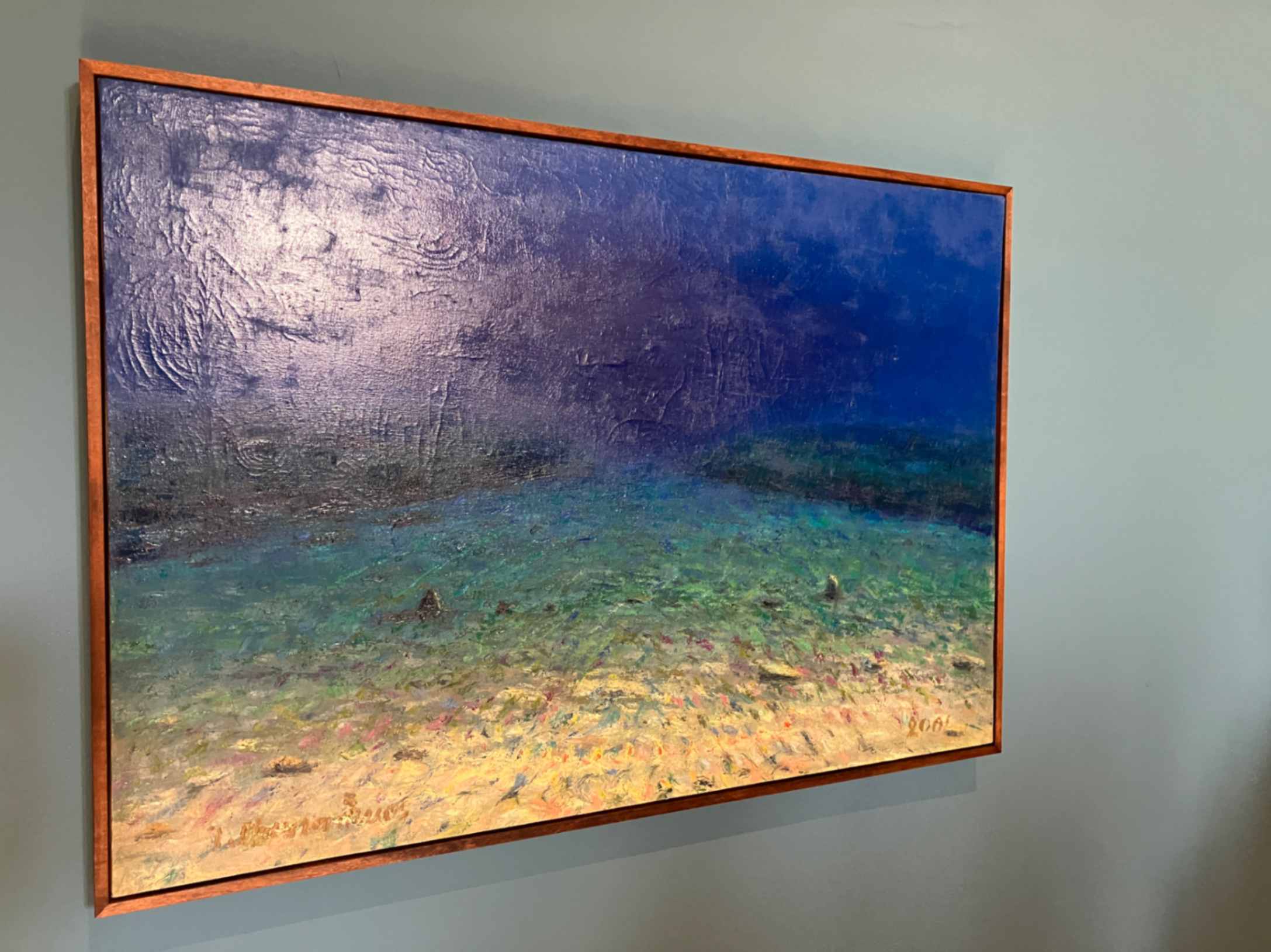 L’inaspettato è a un passo da noi: Yiannis Maniatakos dipinge sott’acqua percorsi dentro ad un mondo che parrebbe precluso alla pittura, trasforma i fondali nel terreno ideale per raccontare il suo mar Egeo. Umori e tonalità che spesso ci sono estranee emergono dalle tele avvolte dalla magia dell’impensabile. Partecipiamo degli ambienti comuni ai cercatori di perle mentre incontriamo l’opera di Monira Al Qaridi che con la sua opera ci porta nel mar Persico e nelle trasformazioni. Cosa accade quando un’economia legata alle perle diventa un terreno di estrazione petrolifera?