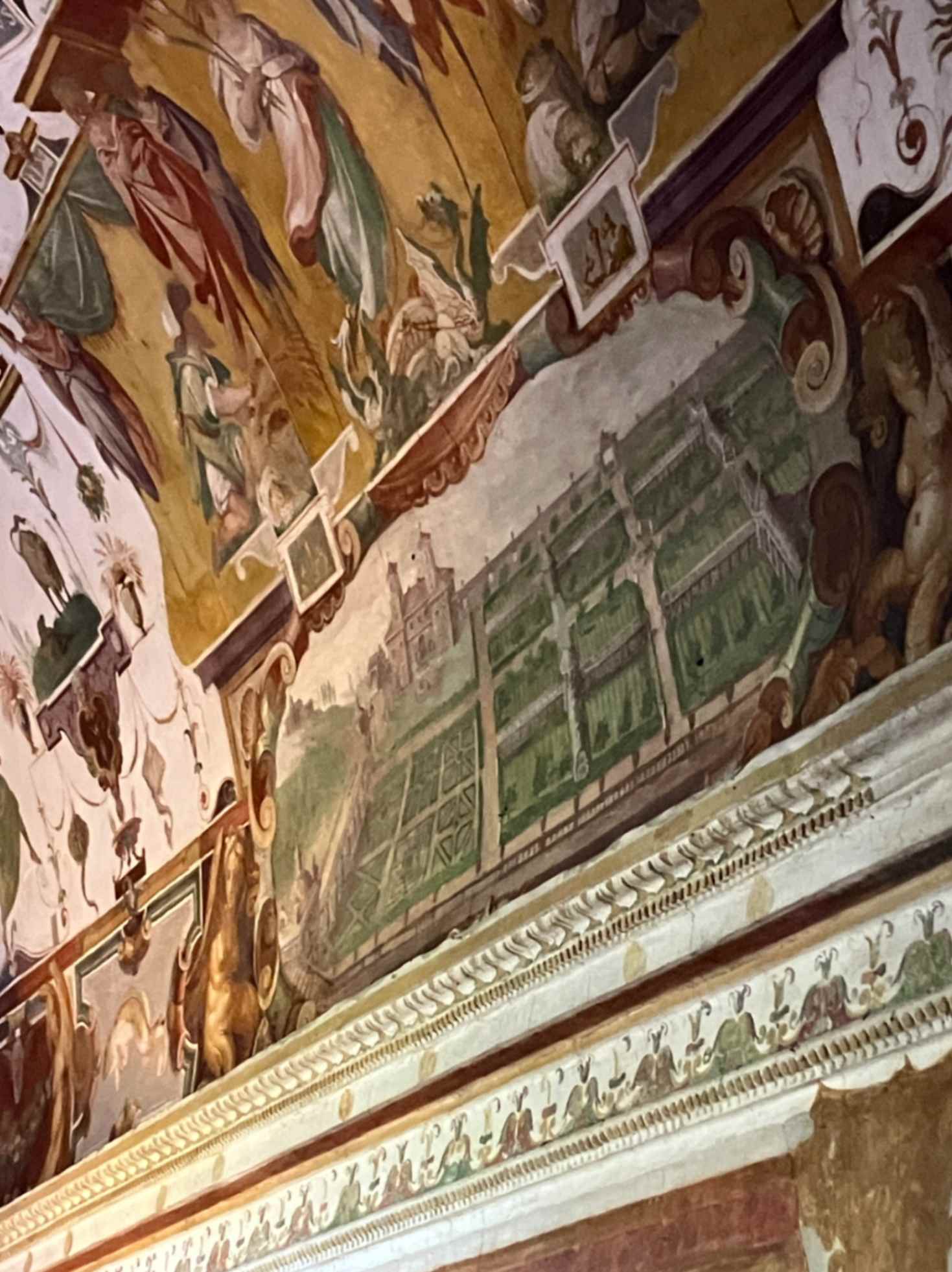 Se ne apprezza da subito la sobrietà e la chiarezza espositiva che portano a guardare alle fontane della Villa con una maggior congruenza storico artistica. Una storia di desideri di grandezza. In questa armonia l’unione col passato continua a riverberare in un’architettonica che sfiora quasi i cinquecento anni. Un giardino complesso, pensato in tre diverse porzioni con tre diverse funzioni: fiori, frutti e piante selvatiche (“il bosco” come dicono i toscani). Nel piccolo tour con Hervé c’è anche il tempo per una visita brevissima nello studiolo del cardinale che ha nei suoi affreschi a grottesca di Jacopo Zucchi, la rappresentazione pittorica la visione ideale che il cardinale immaginava di realizzare al tempo (1570-1571).
