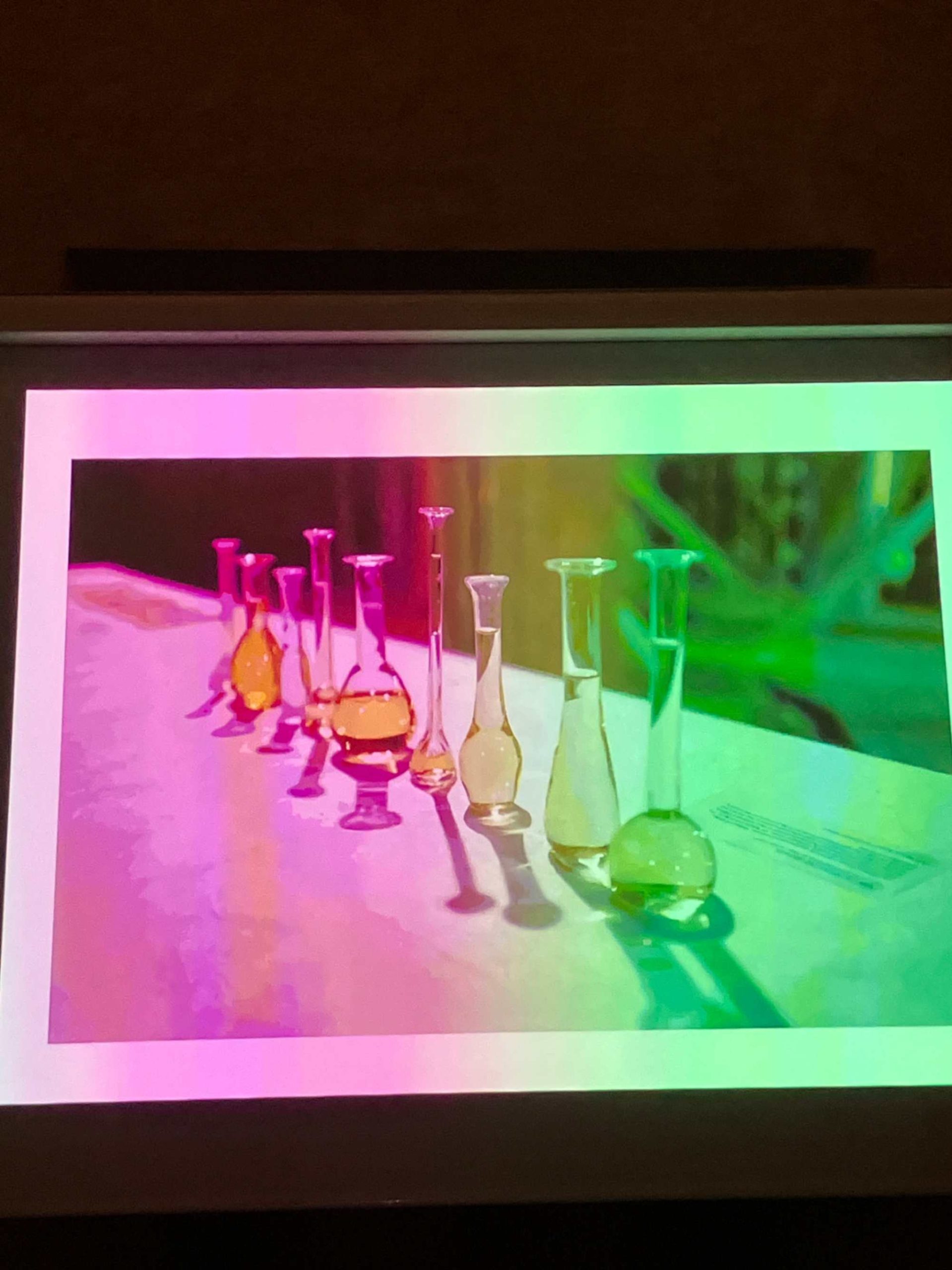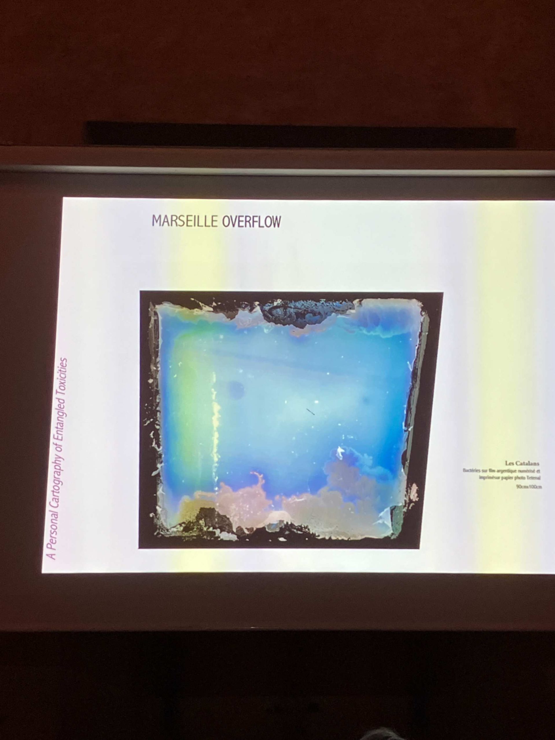 Scopriamo che le sue immagini e installazioni nascono anche dall’uso dei batteri che sono presenti nelle acque delle coste del mar libico. Le le forme che vediamo nascono dalla relazione tra questi batteri il loro lavoro attivo sulla pellicola fotografica.
