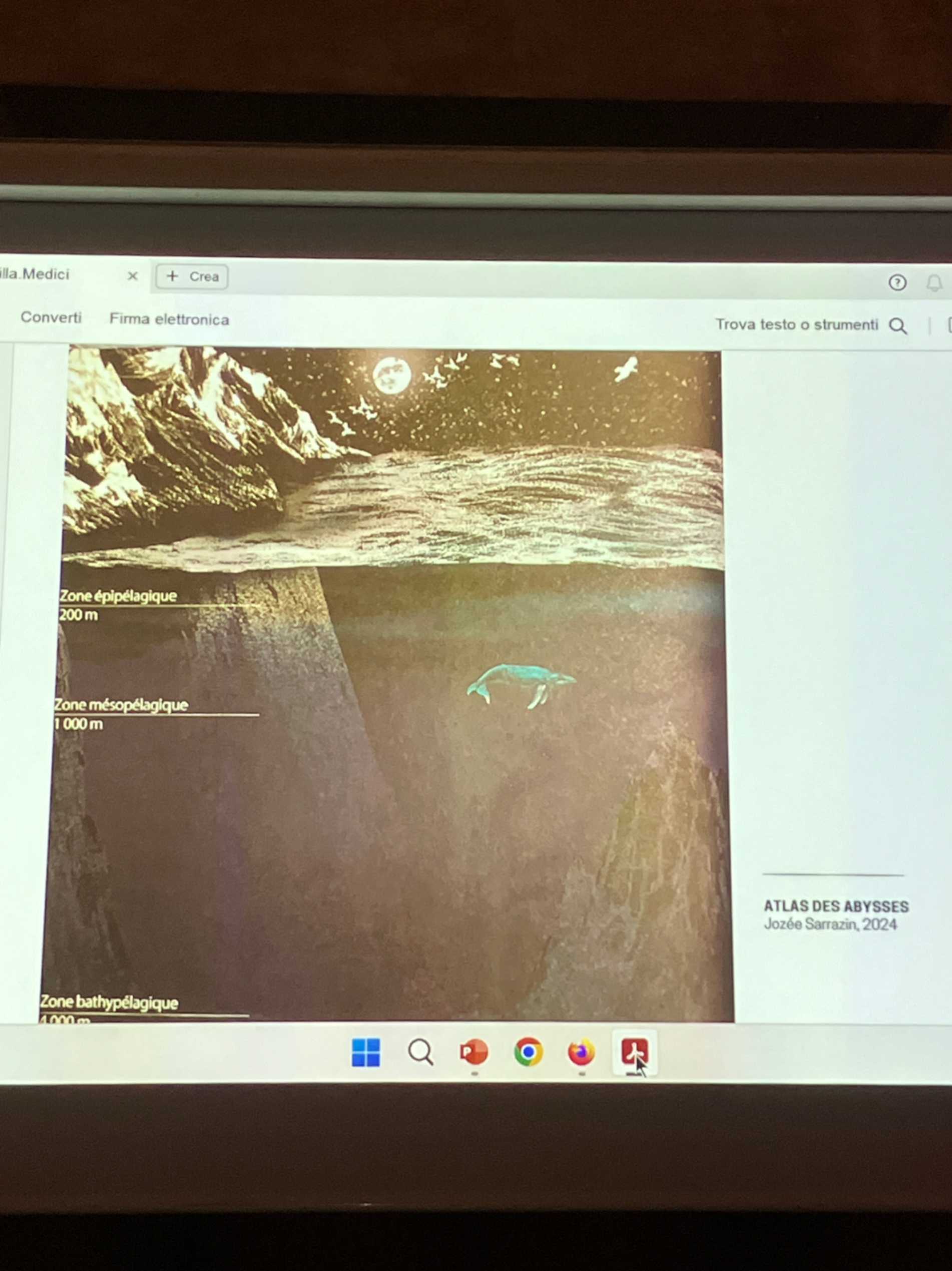 Le ipotesi suggestive si moltiplicano. Pauline accenna alla vista segreta dei polipi, alle loro incredibili capacità comunicative, ed alle ricerche che tendono a vedere in molte delle loro comunicazioni, anche veri e propri canti, e poesie degli abissi.