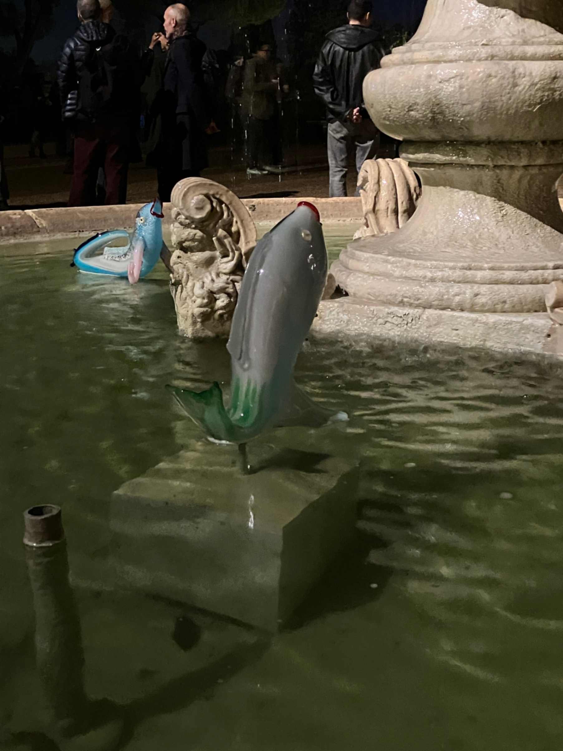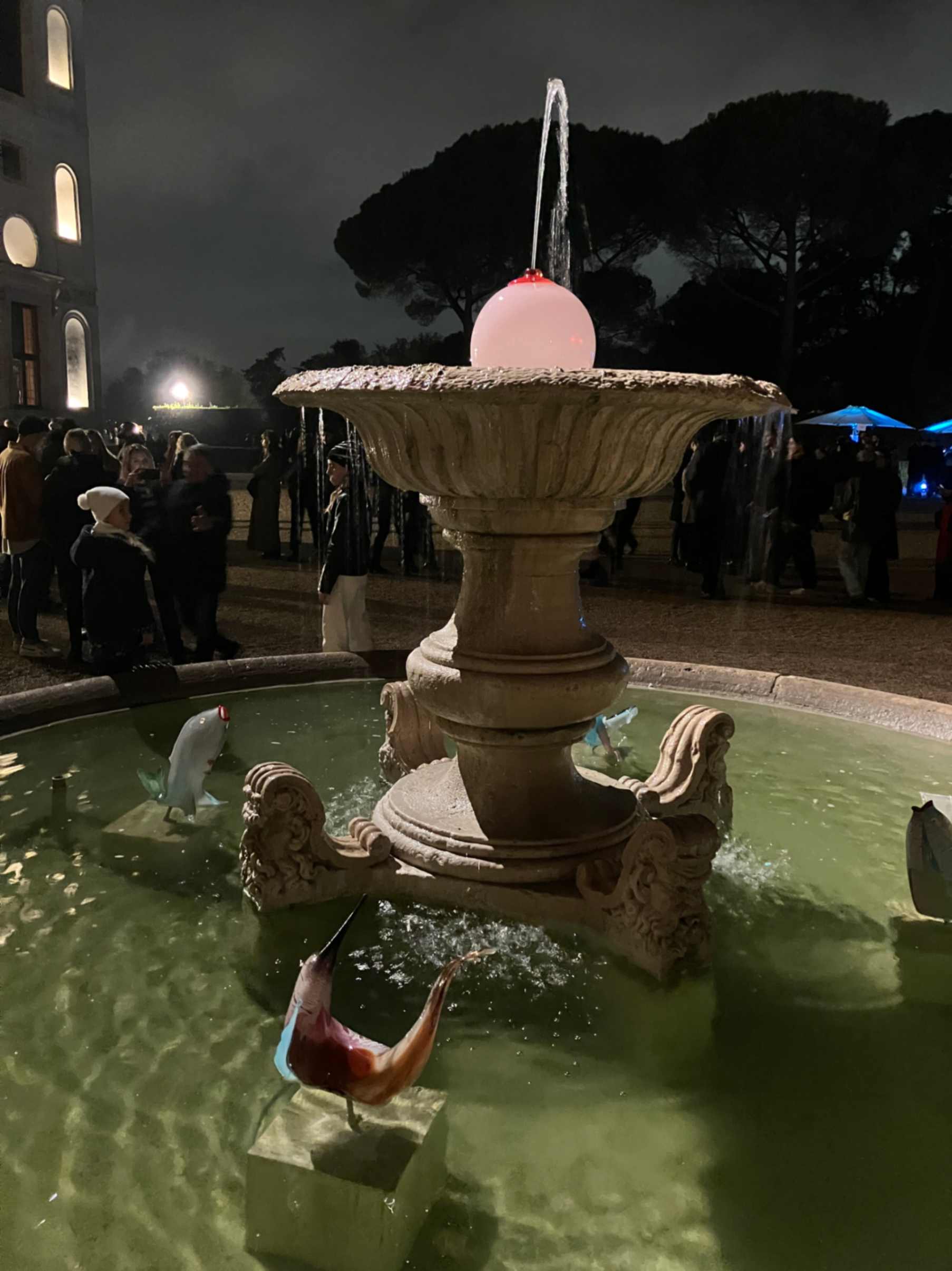 Vengo richiamato dal gorgheggiare della fontana centrale interna alla villa, anche nella penombra si può godere dell’installazione di Laure Prouvost, un’opera che partecipa del “Canto delle Sirene” in corso. Nelle intenzioni dell’artista un dialogo tra memoria e sogni, per me fluido accompagnamento tra studi aperti e viste notturne su Roma.