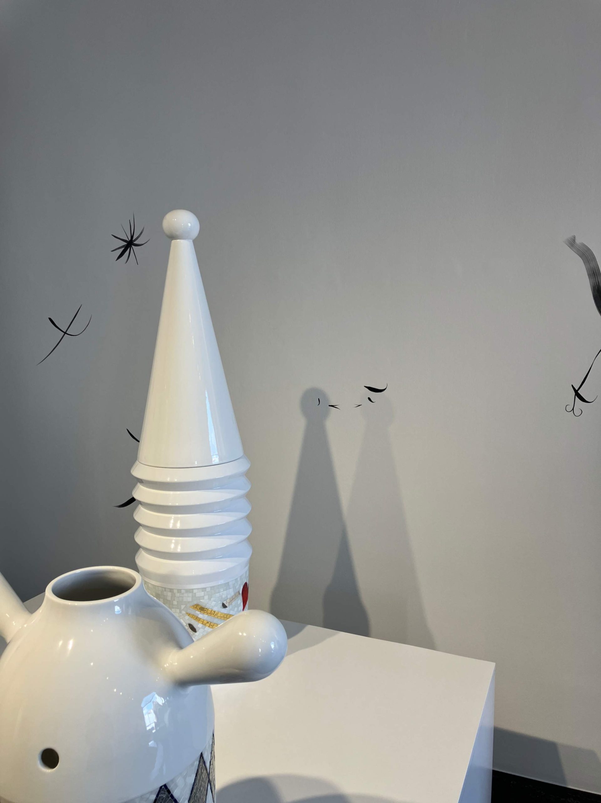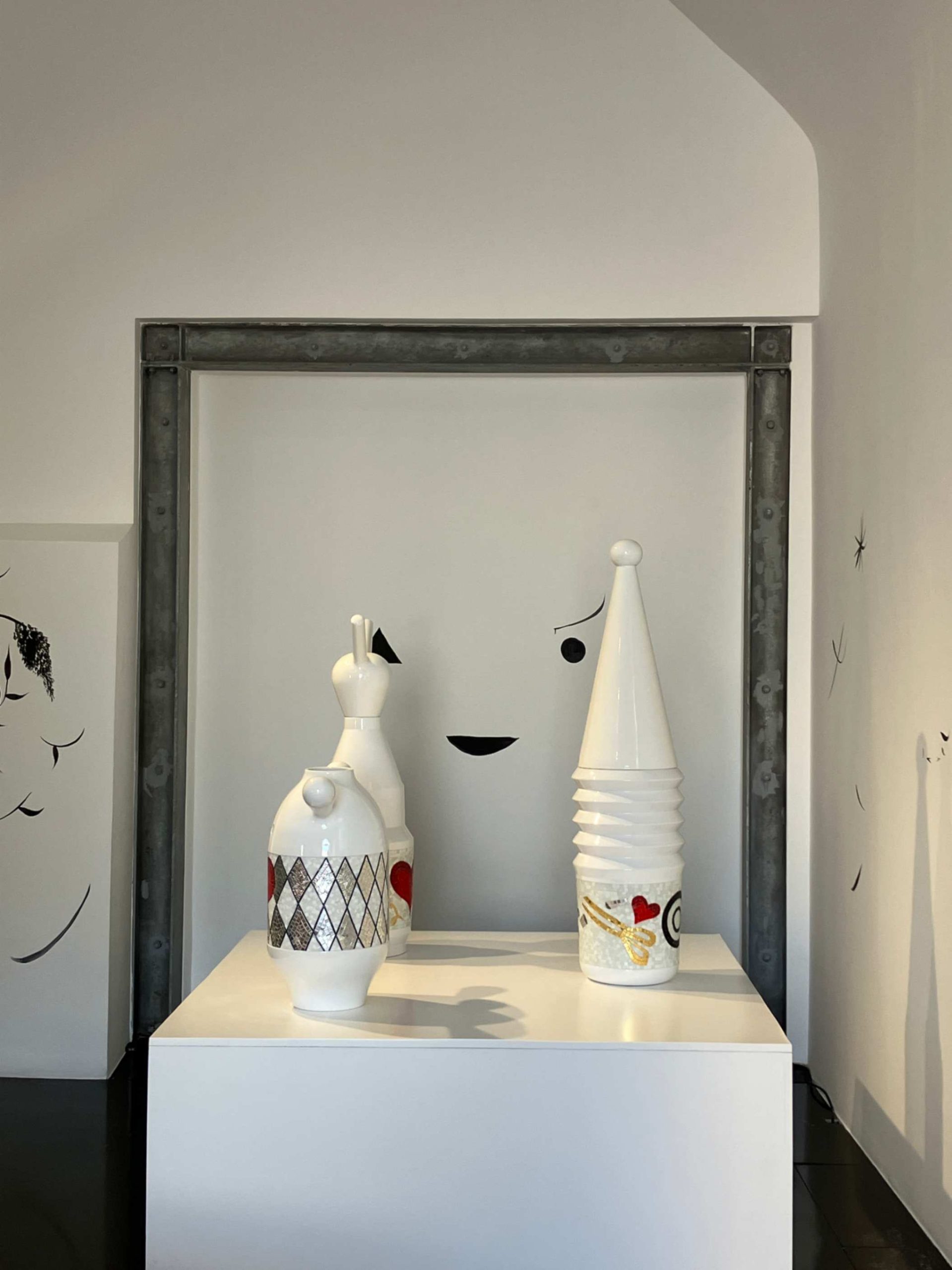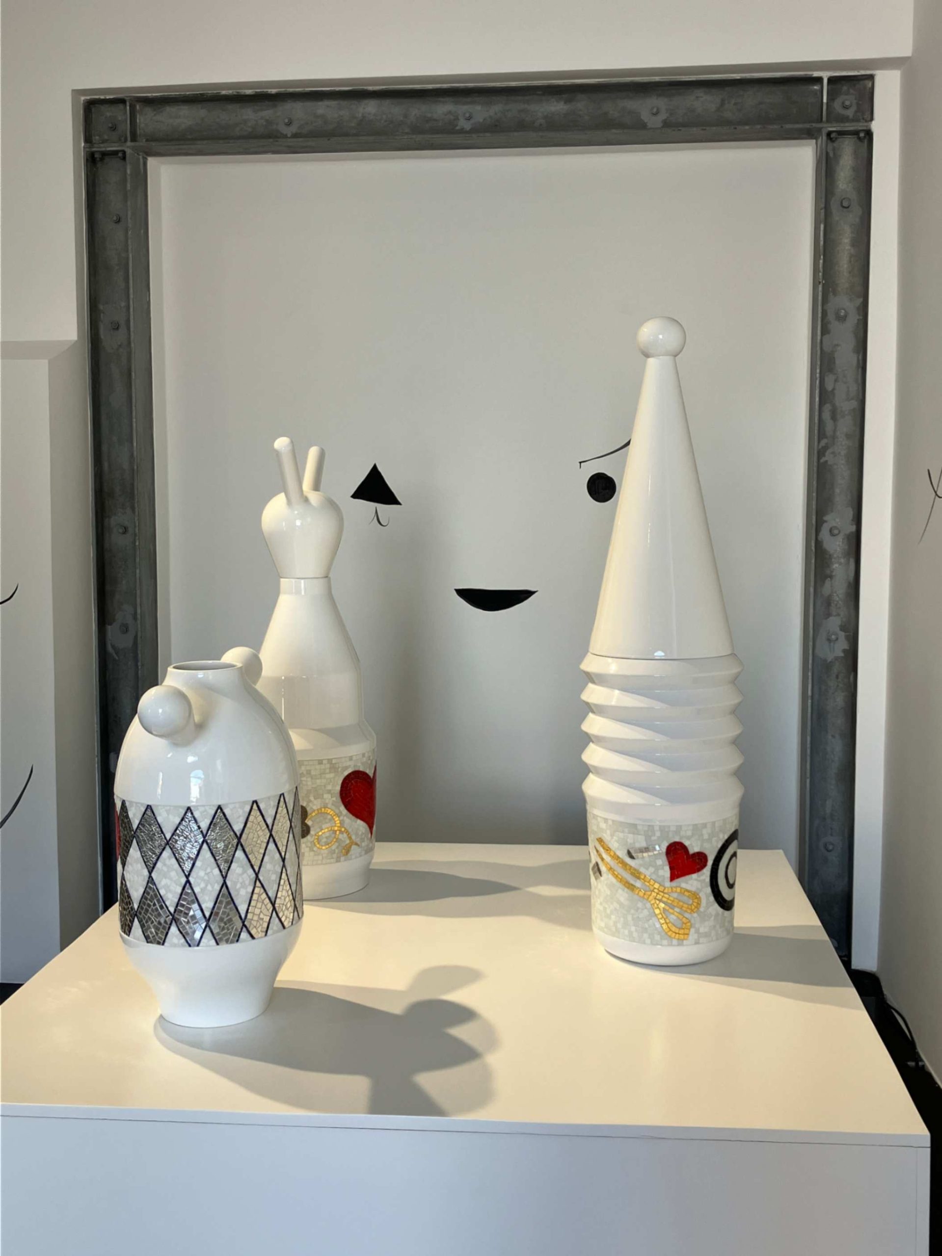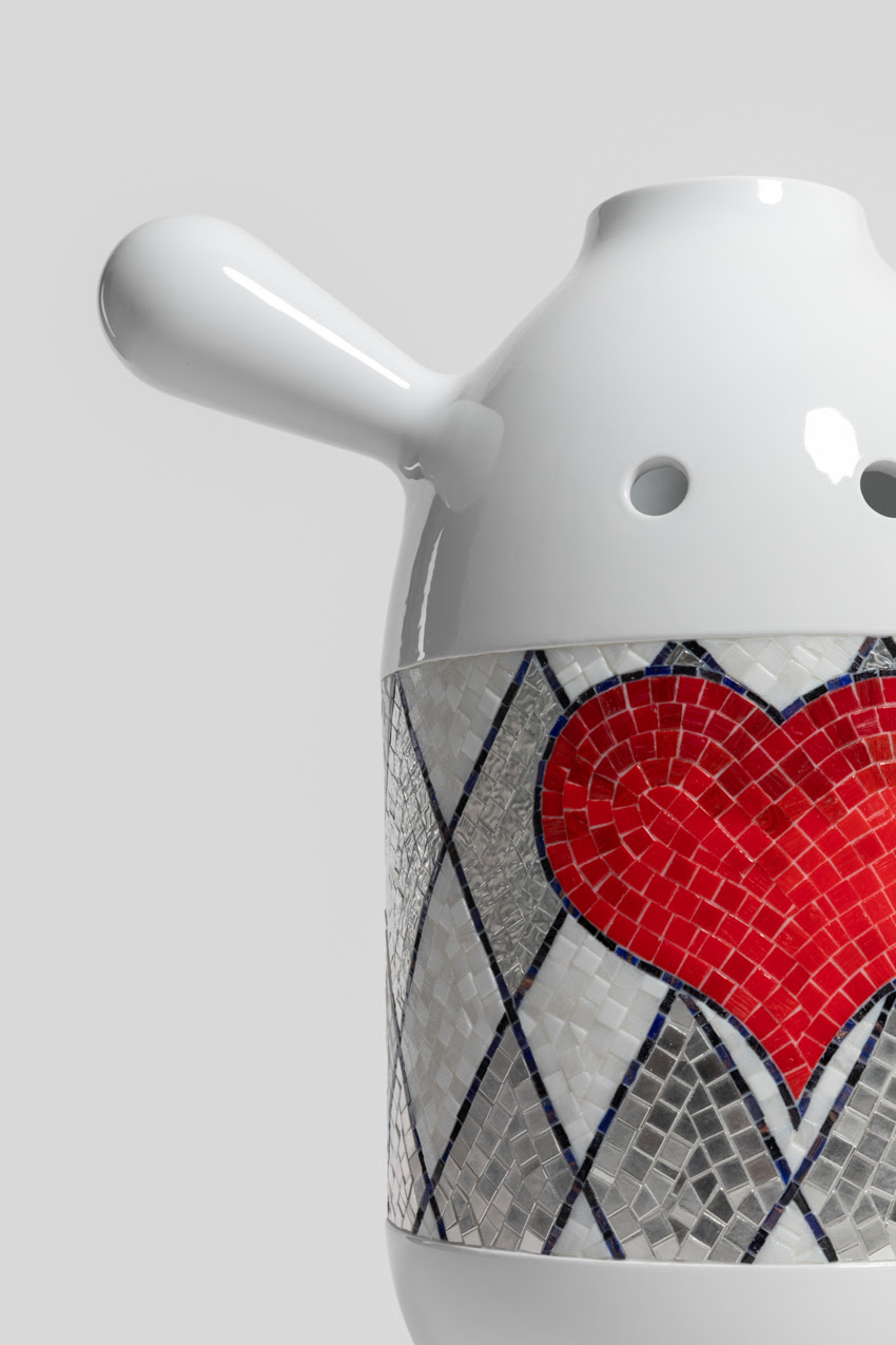 Le loro sagome – a volte snelle e slanciate, a volte rotonde e generose – sono coronate da un “cappello” o da una piccola testa e ornate da un’ampia fascia di mosaici con i personaggi della fantasia di Hayon: uccelli stilizzati, volti espressivi, motivi geometrici, arabeschi dorati e grandi cuori rossi, elementi che si fondono in uno stile sofisticato e giocoso al tempo stesso.