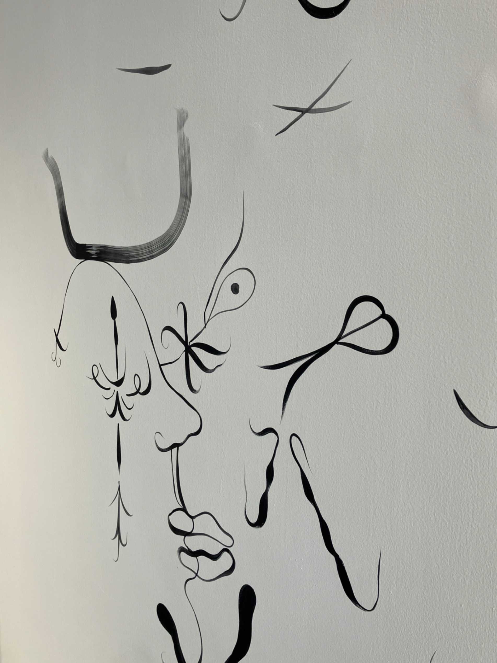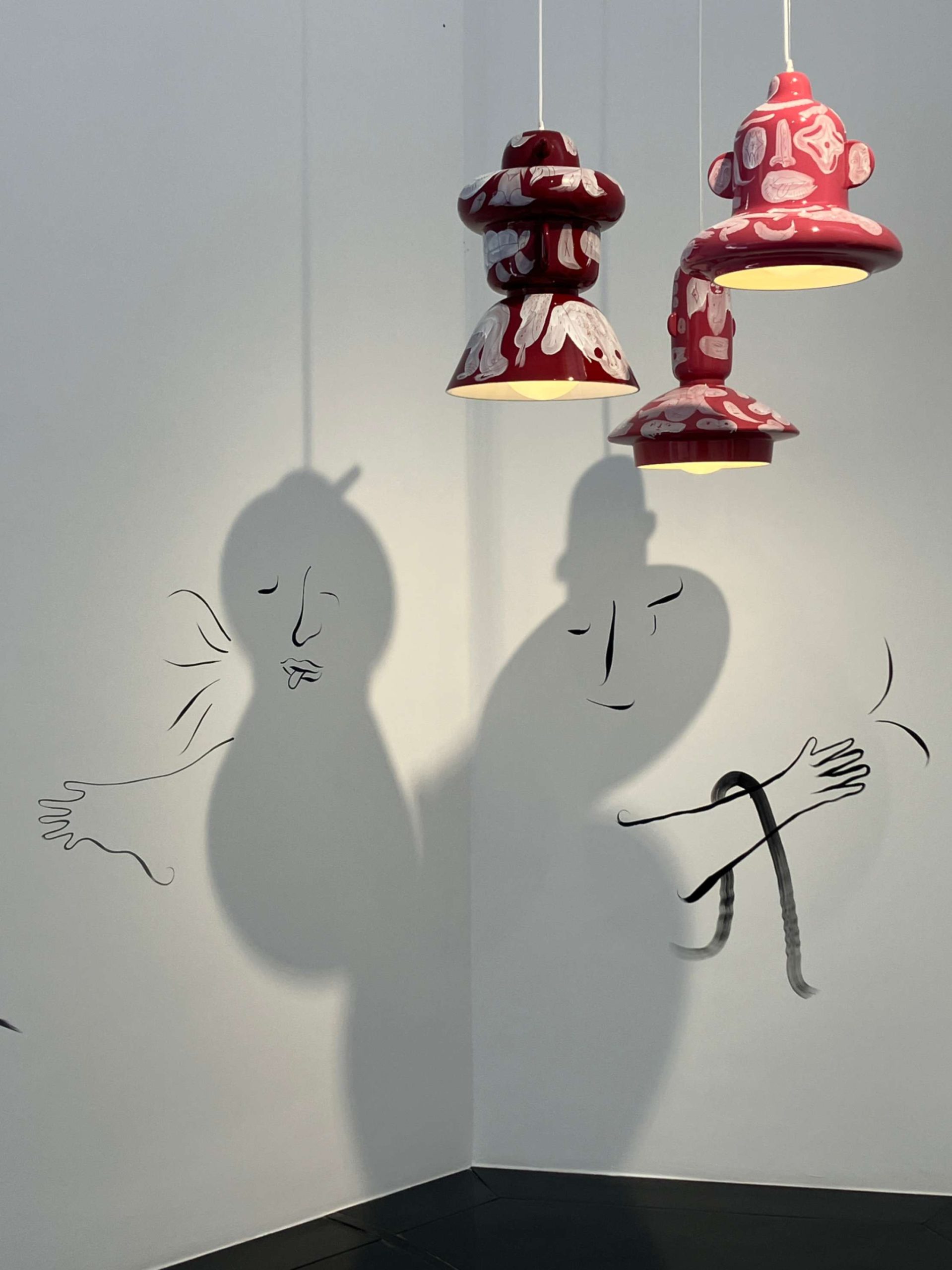 In questa bifrontalità che la mostra pone, trovo che si possa rintracciare qualcosa che ha a che fare con il desiderio di dare forma a qualche specie di sogno, in particolar modo per il gioco di ombre e acrilici che Jaime Haynon ha sviluppato durante la notte prima dell’apertura ufficiale, dipingendo le pareti che avvolgono le sue e altre opere di artisti designer selezionati da Kreo.